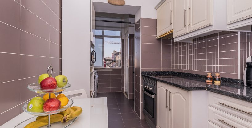 A cozinha é renovada e equipada com placa, exaustor, forno elétrico, lava-loiça, frigorífico e tem espaço para uma mesa que permite fazer ali o pequeno-almoço e refeições rápidas. Além da cozinha, há uma área de serviço e lavandaria com uma grande janela que consente secar a roupa rapidamente mantendo o perfume da lavagem.